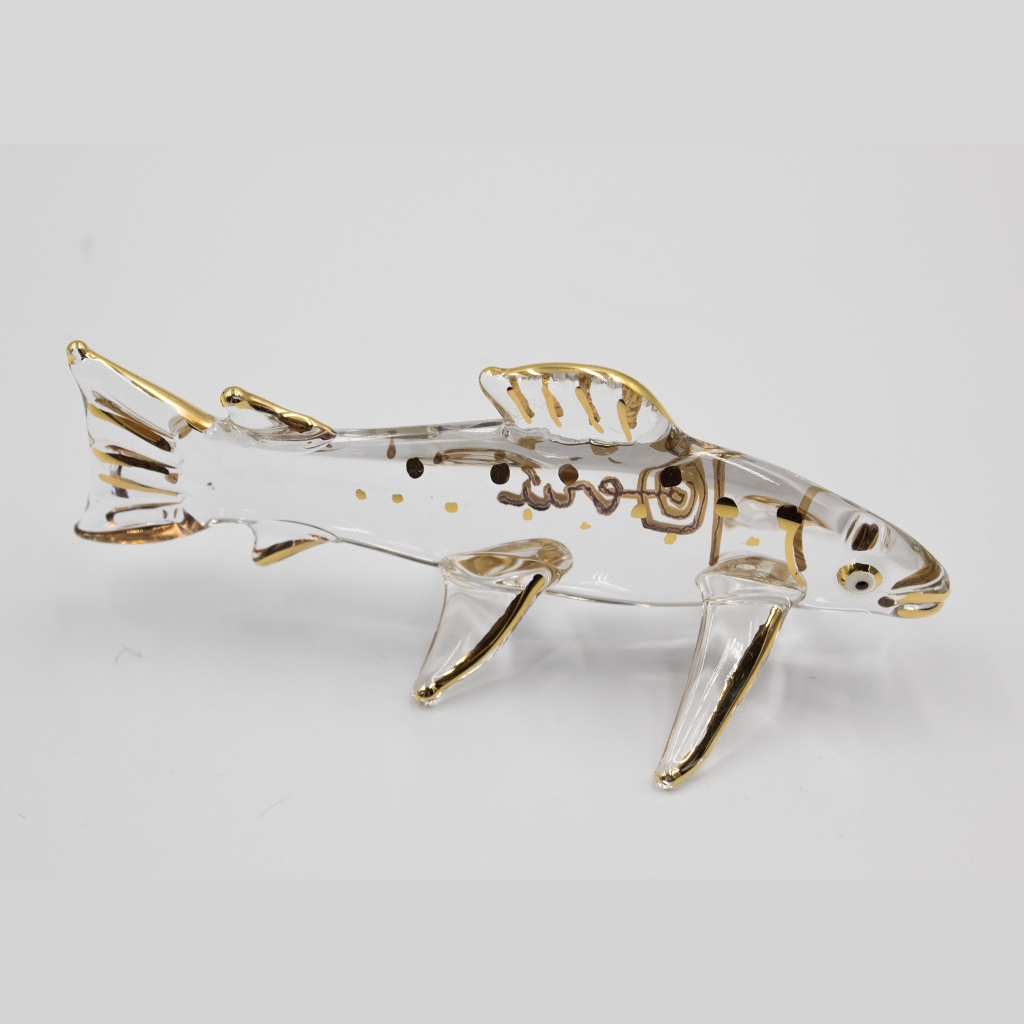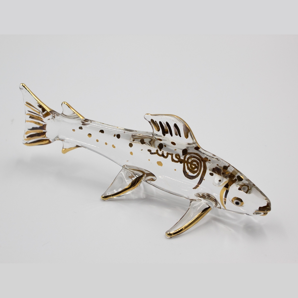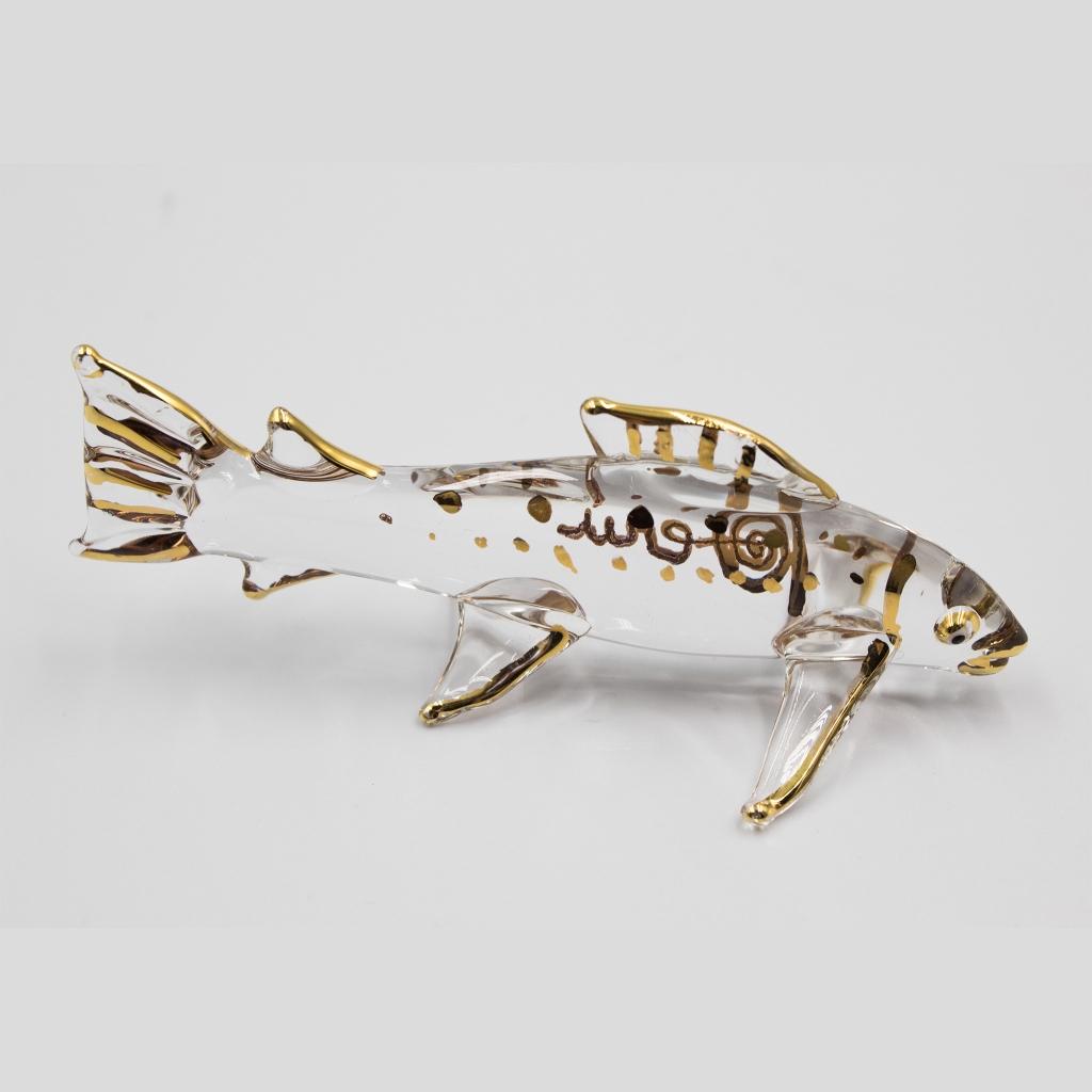 The trout is a typical fish found in the rivers of Peru but trout hatchery is now a very popular attraction around the Huancayo area, for tourist interested in this kind of fish, their reproduction process and lifecycle. The production is destined to local markets and restaurants. In this case Milton Ríos has made a representation of this fish in handmade recycled glass with details in liquid gold paint, the longest measuring 16 cms long. A great gift indeed!!