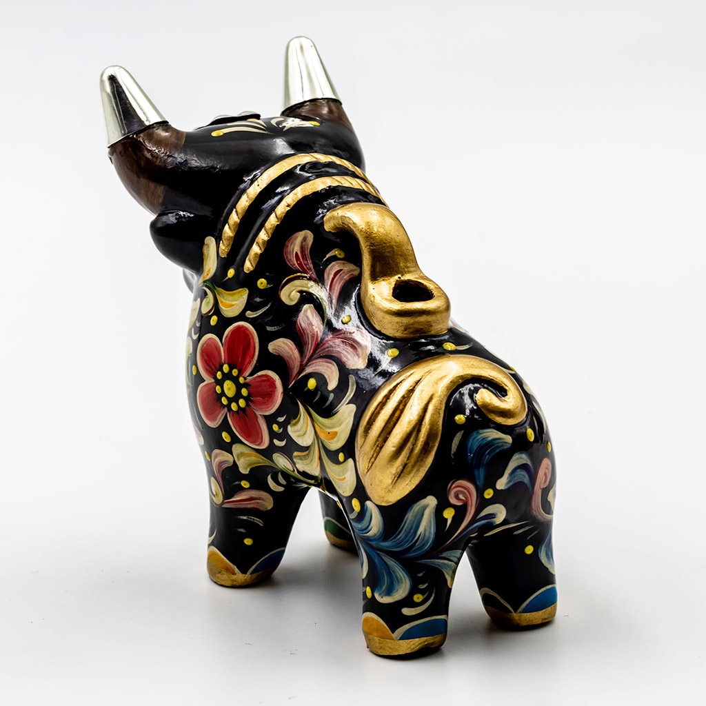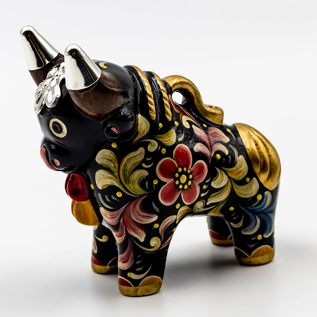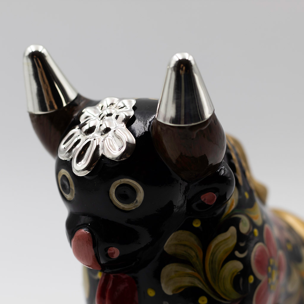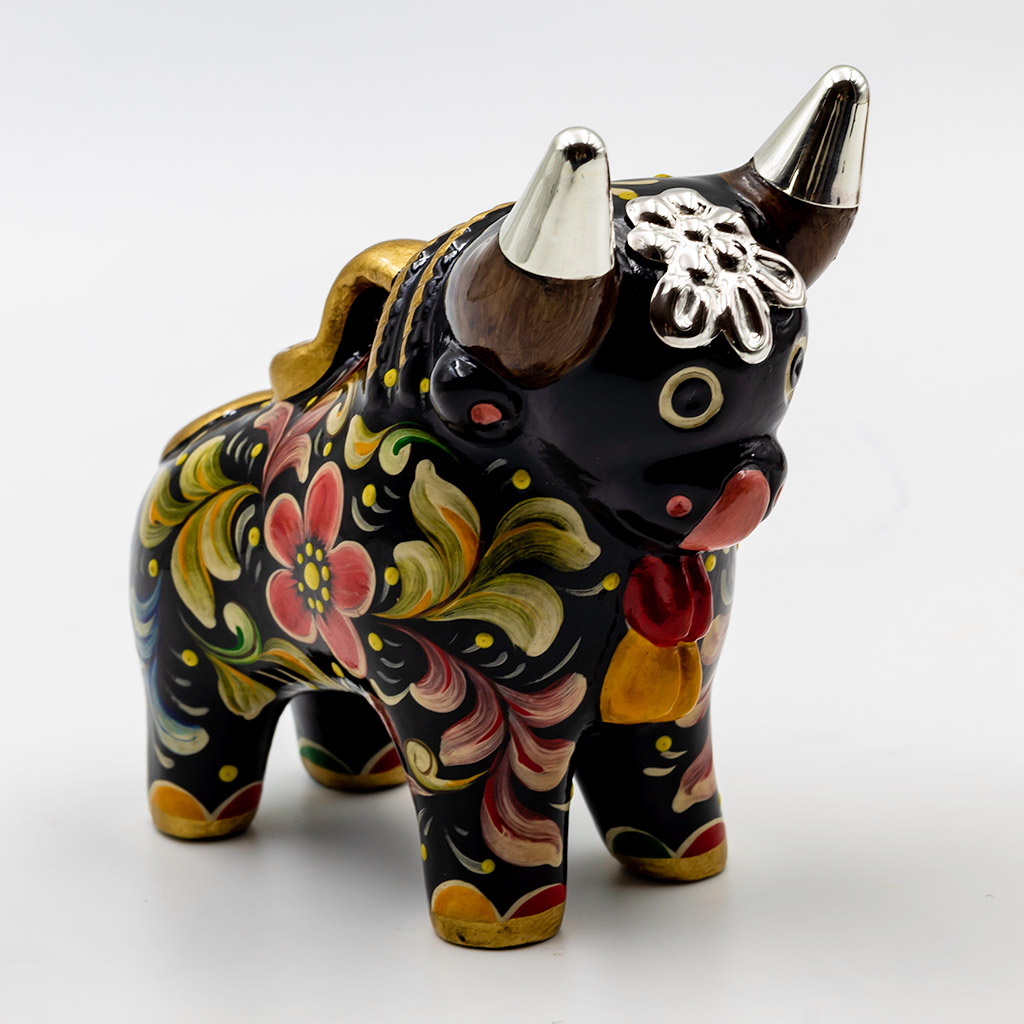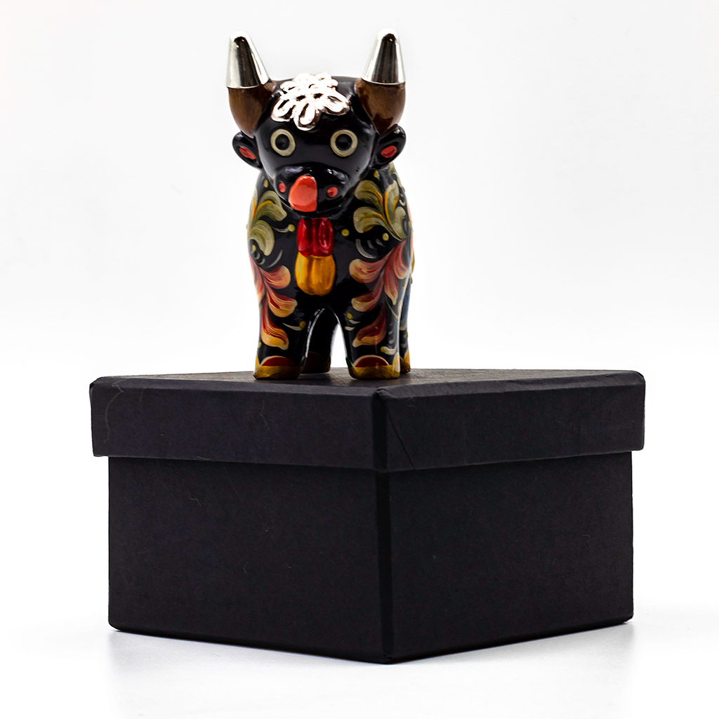 Handcrafted 10 cms. Ceramic Pucara Bull with Peruvian Sterling Silver Details – Black