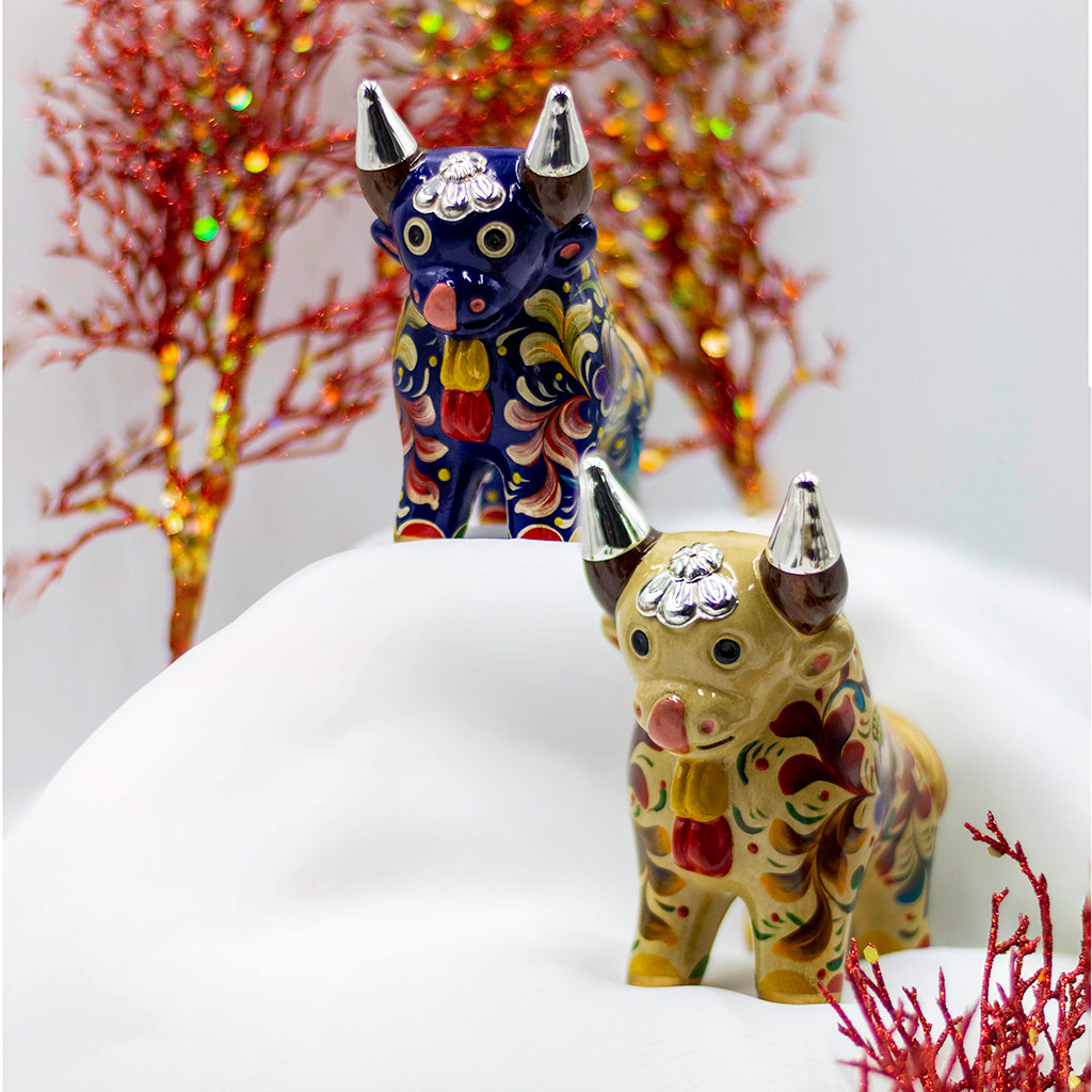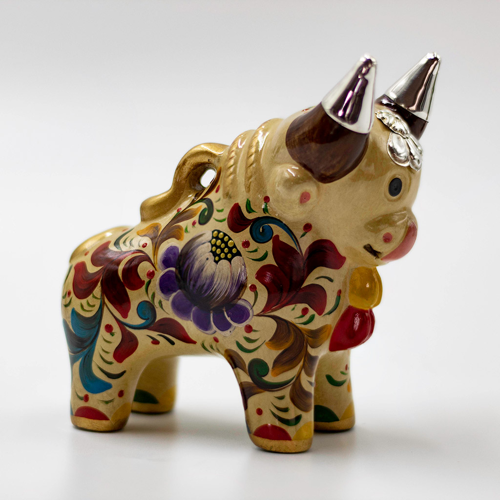 Handcrafted 10 cms. Ceramic Pucara Bull with Peruvian Sterling Silver Details – Cream