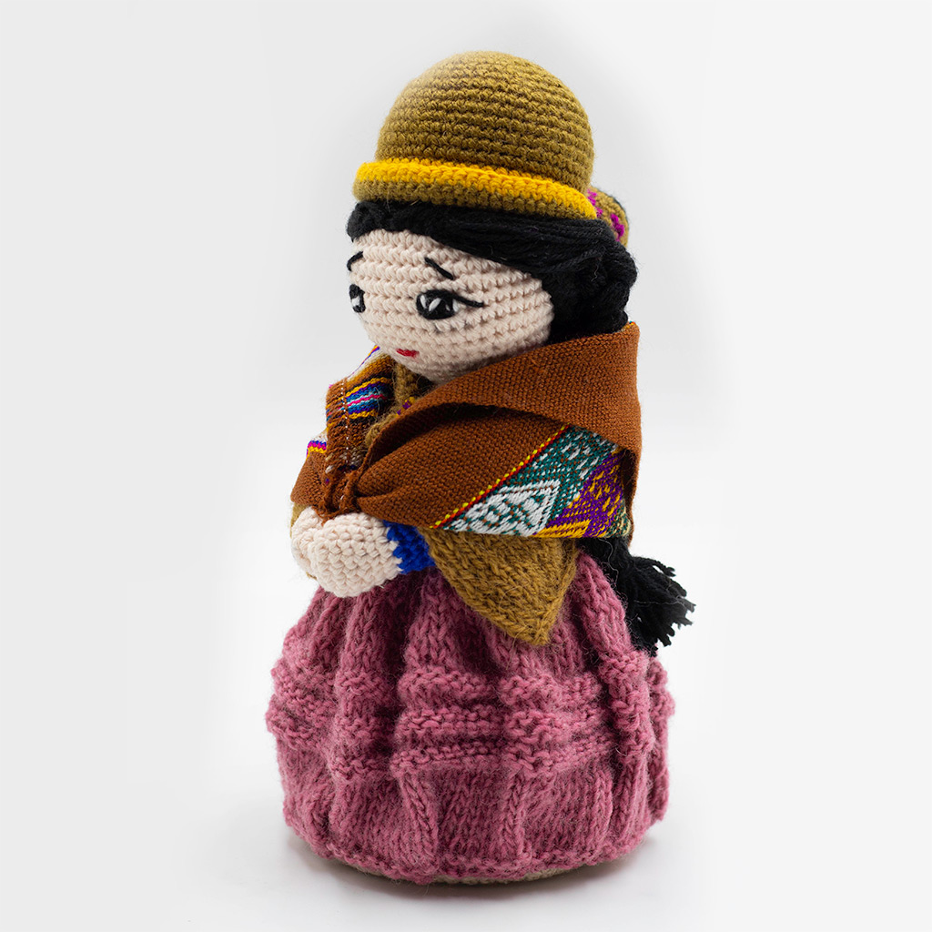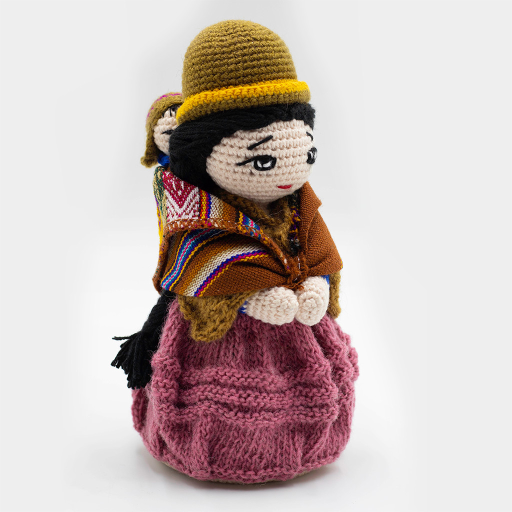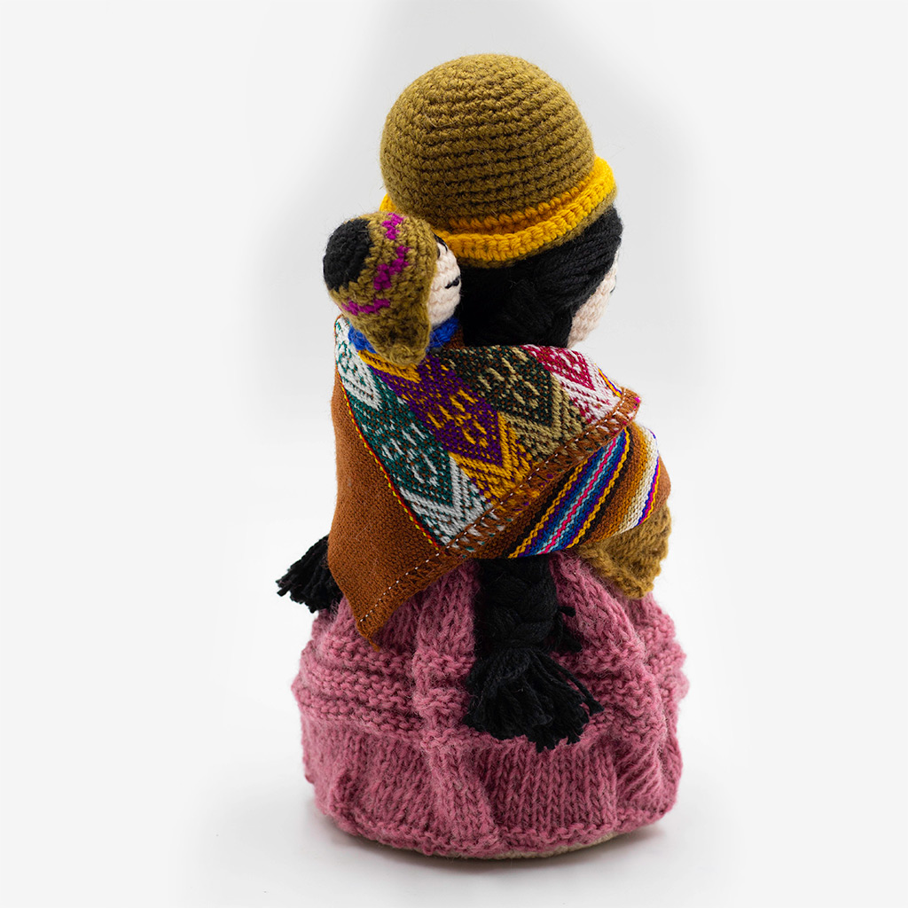 Beautifully handcrafted figure, knitted in alpaca, cotton, wool and andean fabric, depicting a typical Puno lady with her baby on her back, held by an andean fabric wrap.